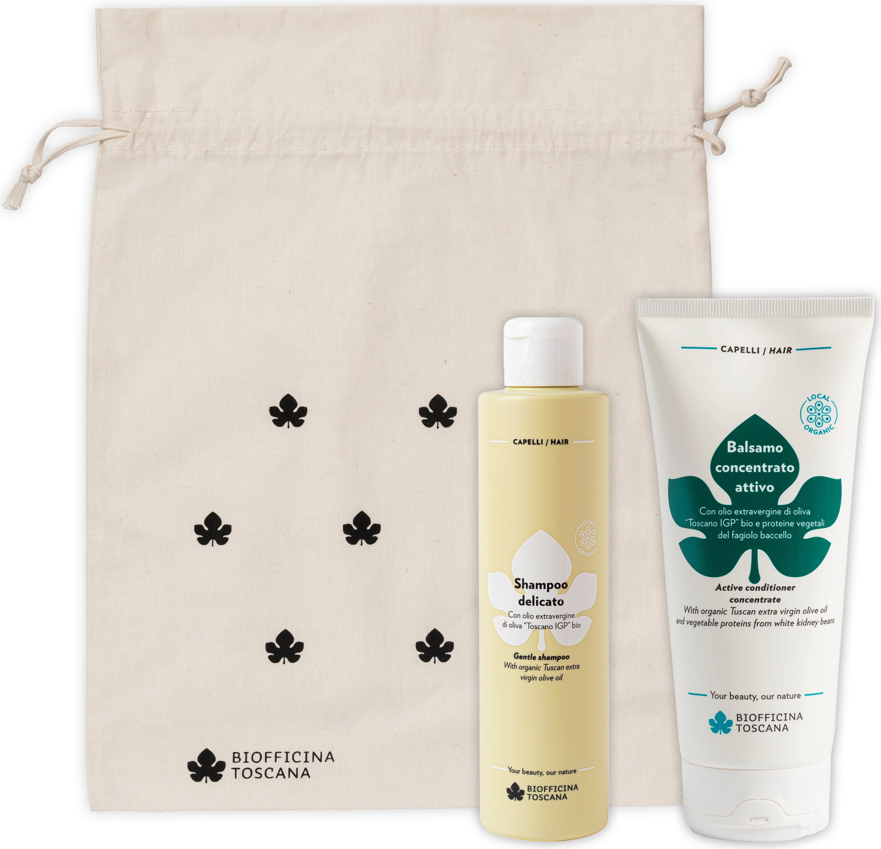 Doprajte svojim vlasom dva najobľúbenejšie produkty od Biofficina Toscana! Koncentrovaný aktívny kondicionér s bohatým a vyživujúcim zložením rozčesáva a posilňuje všetky typy vlasov, zatiaľ čo jemný šampón jemne čistí pokožku hlavy a zanecháva vlasy jemné a hodvábne. Dokonalá sada pre lesklé a žiarivé vlasy!