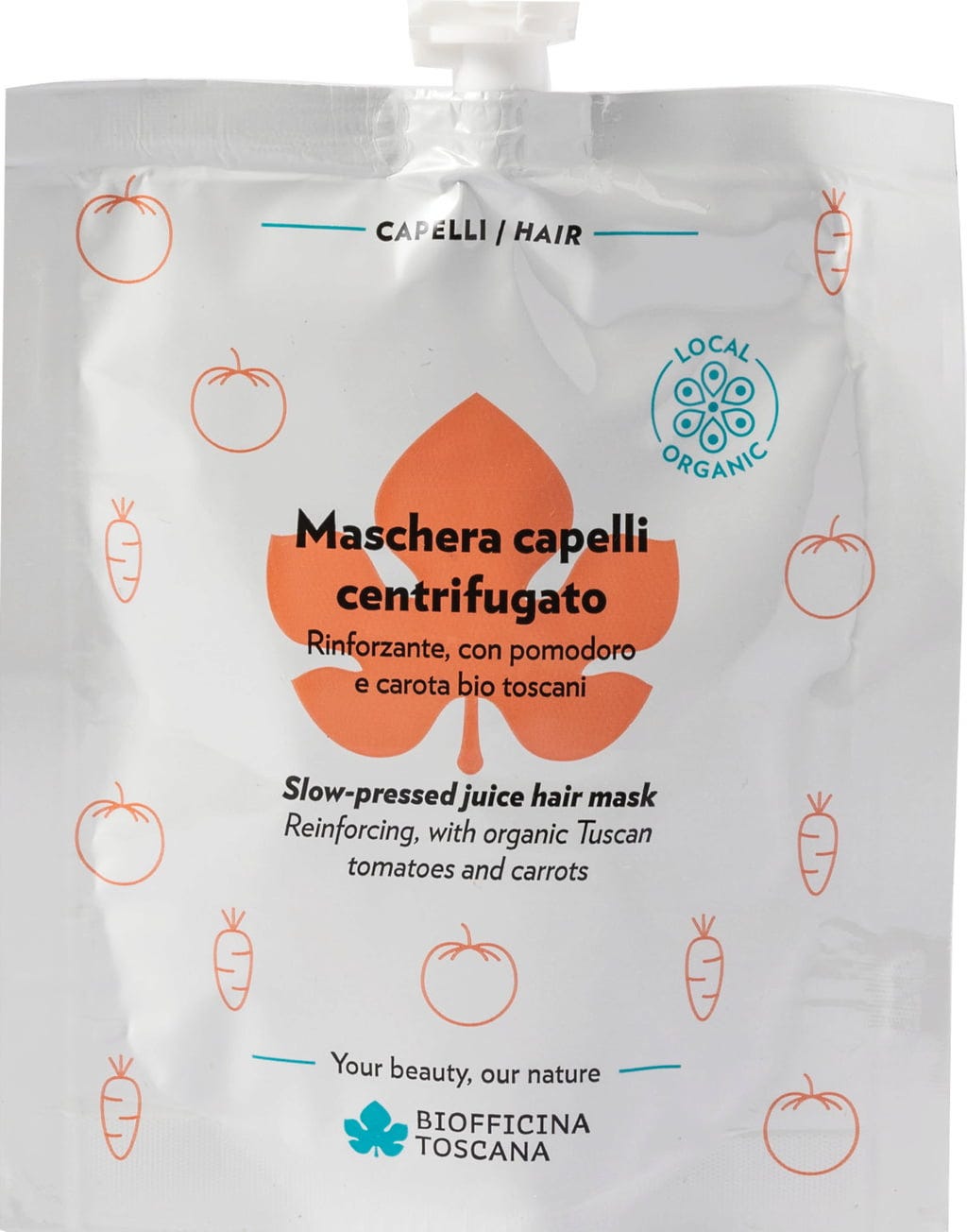 Táto reštrukturalizačná maska na vlasy má kyslú hodnotu pH a ponúka ideálnu starostlivosť pre ošetrené a poškodené vlasy. Receptúra obsahuje Biofficina Toscanas Liquepom®, špeciálny extrakt z organickej toskánskej paradajkovej šupky, ktorá je bohatá na antioxidačný lykopén, a preto má antioxidačné a ochranné vlastnosti. Spolu s bio extraktom z toskánskej mrkvy a zmesou vitamínov na rastlinnej báze budú vlasy vyživené a vitalizované bez zaťaženia.