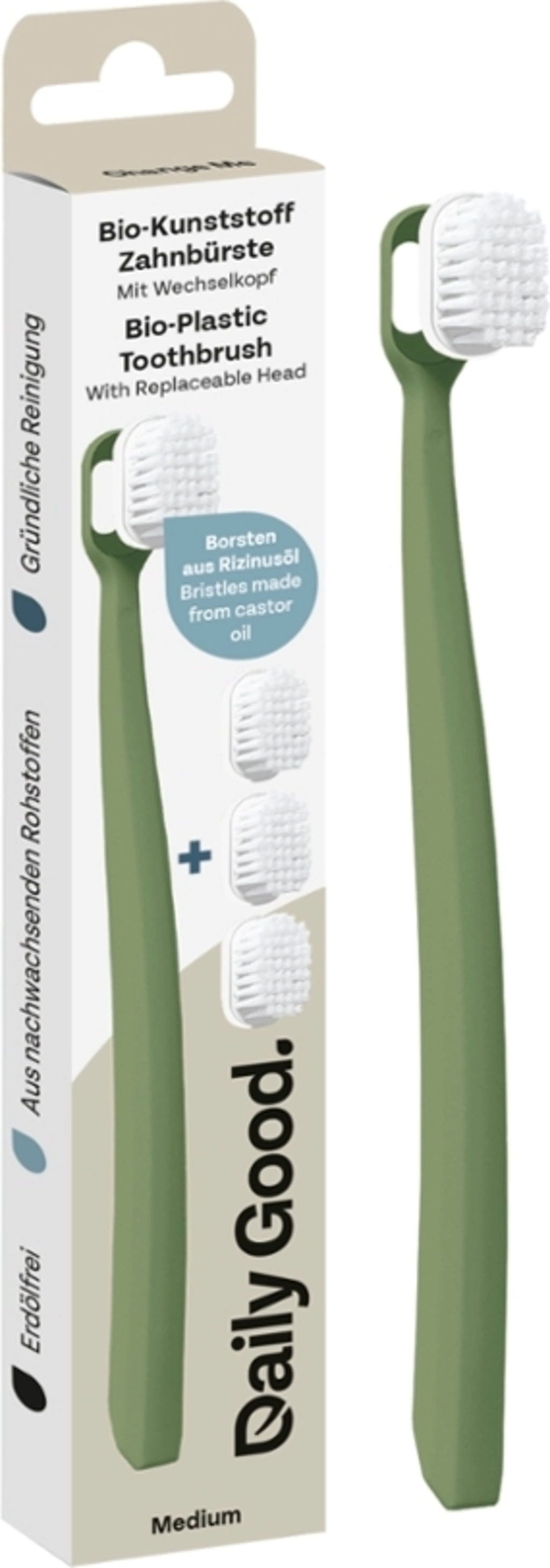 Táto zubná kefka vás niekoľkokrát denne podporuje pri vašej dentálnej hygiene a pomáha vám vedome sa vyhýbať produktom z minerálnych olejov. Rukoväť je vyrobená z bioplastu na báze obnoviteľných zdrojov, ako je celulóza. Štetiny sú vyrobené z ricínového oleja. Praktické vymeniteľné hlavice tiež pomáhajú znižovať odpad.