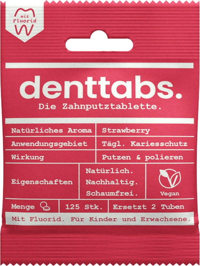 Jahodové tablety na čistenie zubov boli vyvinuté špeciálne pre celú rodinu. Presviedčajú jemnou jahodovou chuťou, 100 % prírodnými ingredienciami a zníženým, upraveným obsahom fluoridov na 500 ppm. Bez obsahu vody, s vegánskym zložením umývajú a leštia zuby jemným spôsobom, čo zaisťuje hladší povrch, bez povlaku či baktérií.