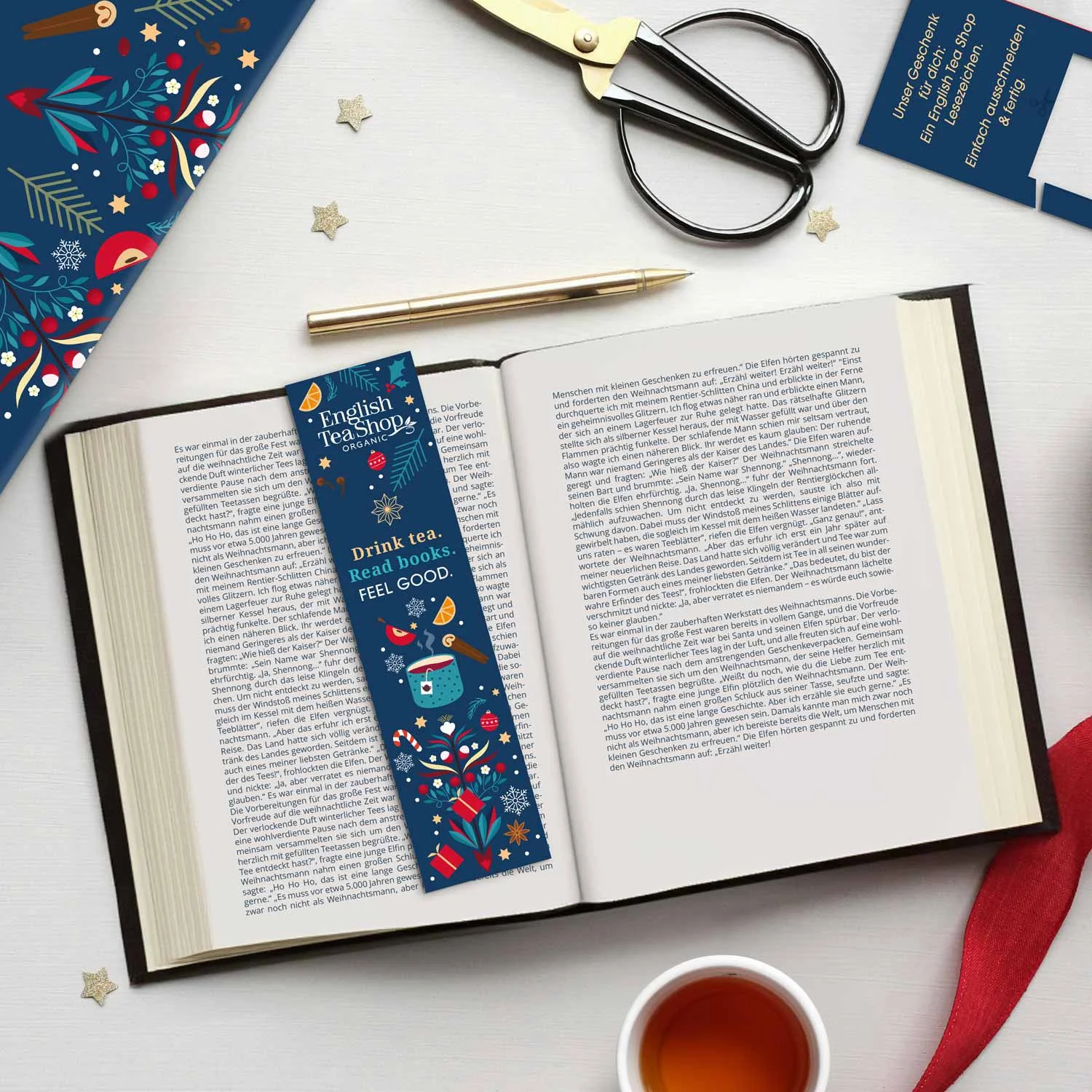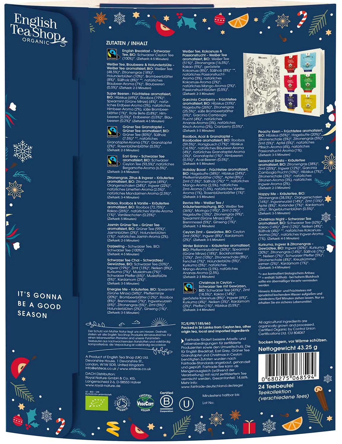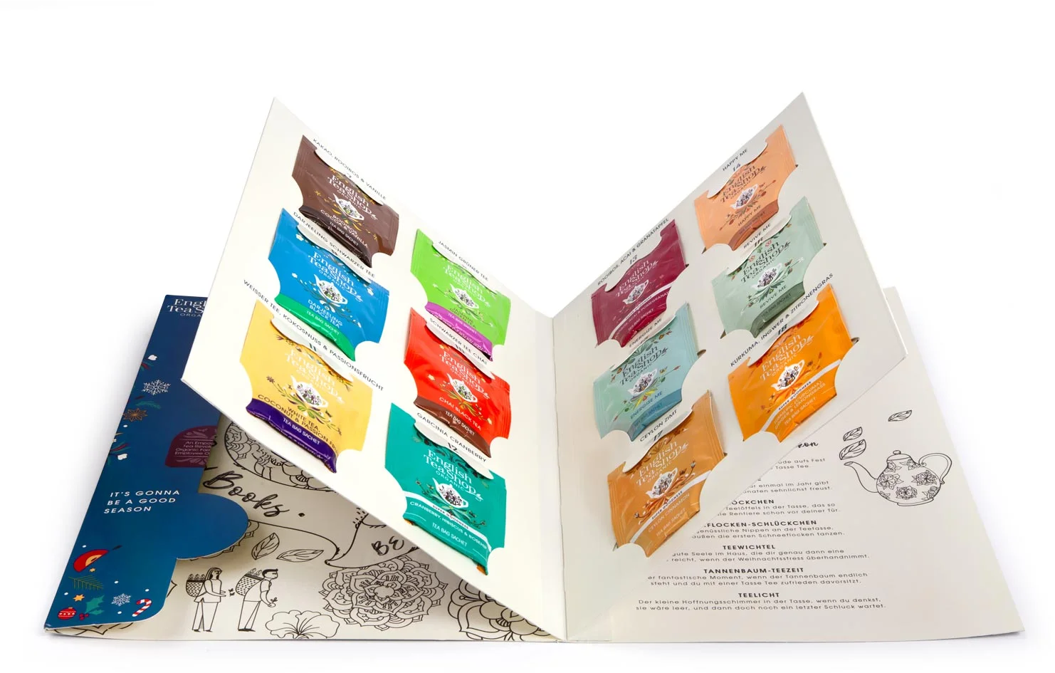 Zvláštnosťou tohto adventného kalendára je, že sa listuje ako kniha a na niekoľkých stranách obsahuje 24 bio čajov a ďalšie doplnky. Čajové zmesi obsahujú špeciálne zimné a vianočné čaje.