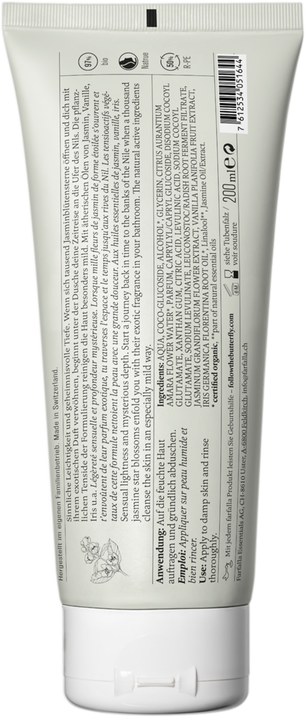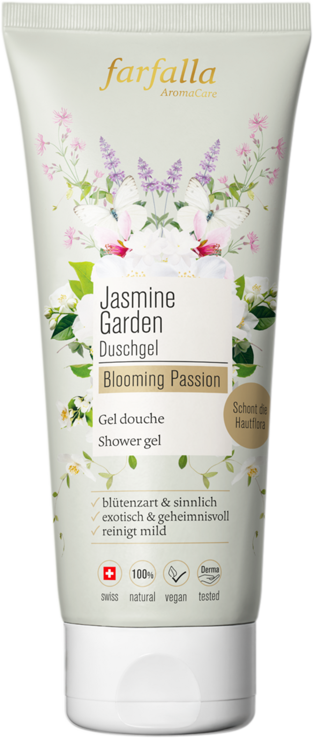 Sprchový gél Jasmin Garden kombinuje zmyselnú ľahkosť s tajomnou hĺbkou. Jeho kvetinovo-exotická vôňa s jazmínom, vanilkou, kosatcom a ďalšími vôňami obaľuje pokožku a rozmaznáva zmysly, zatiaľ čo obzvlášť šetrné zloženie jemne čistí.