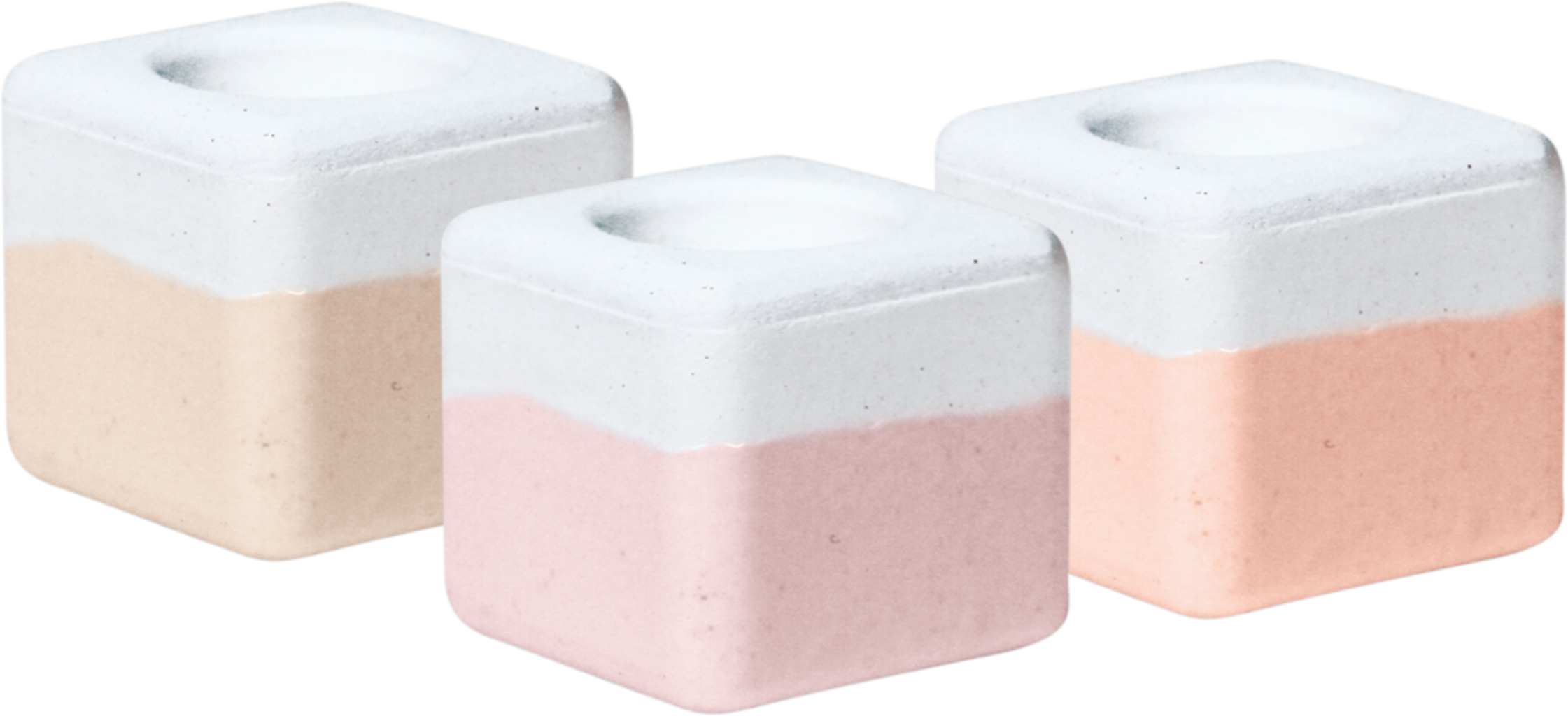 S týmito výraznými vonnými kockami budete mať vždy po ruke ten správny kameň pre váš ďalší vôňový impulz. Či už v izbe, v aute alebo v skrini – tieto malé všestranné doplnky poskytujú príjemnú sviežosť presne tam, kde ju potrebujete. Horný povrch s otvorenými pórmi je ideálny na posypanie esenciálnymi olejmi alebo vonnými zmesami. Spodná polovica je glazovaná v troch štýlových farbách.
