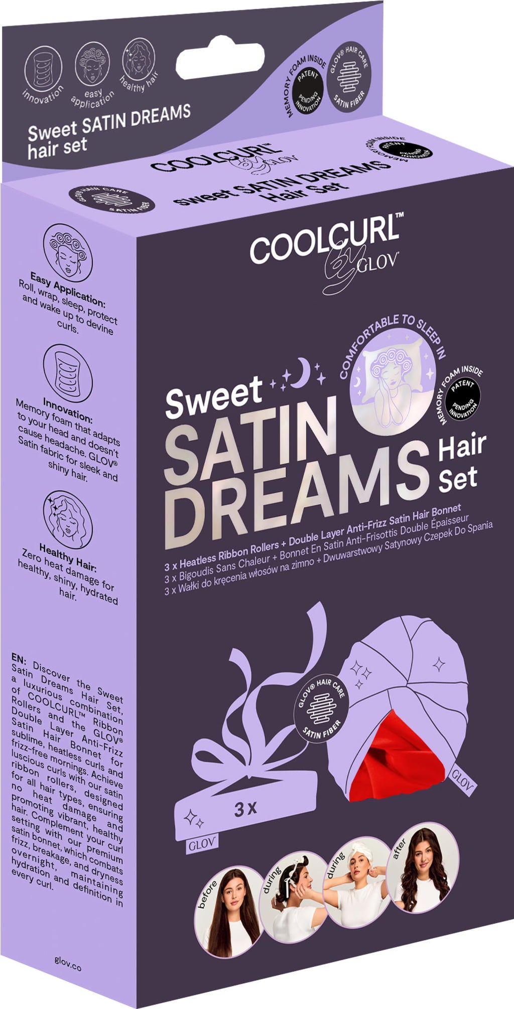 COOLCURL Sweet Dreams Satin Set predstavuje luxusnú kombináciu COOLCURL™ Ribbon Rollers a Anti-Frizz Satin Hair Bonnet. Spoločne sľubujú kučery bez použitia tepla a rána bez krepovatenia. Boli vyvinuté pre všetky typy vlasov a sú mimoriadne šetrné k vlasom. Saténový turban chráni vlasy pred lámaním, stratou vlhkosti a krepovatením a zachováva definíciu kučier.