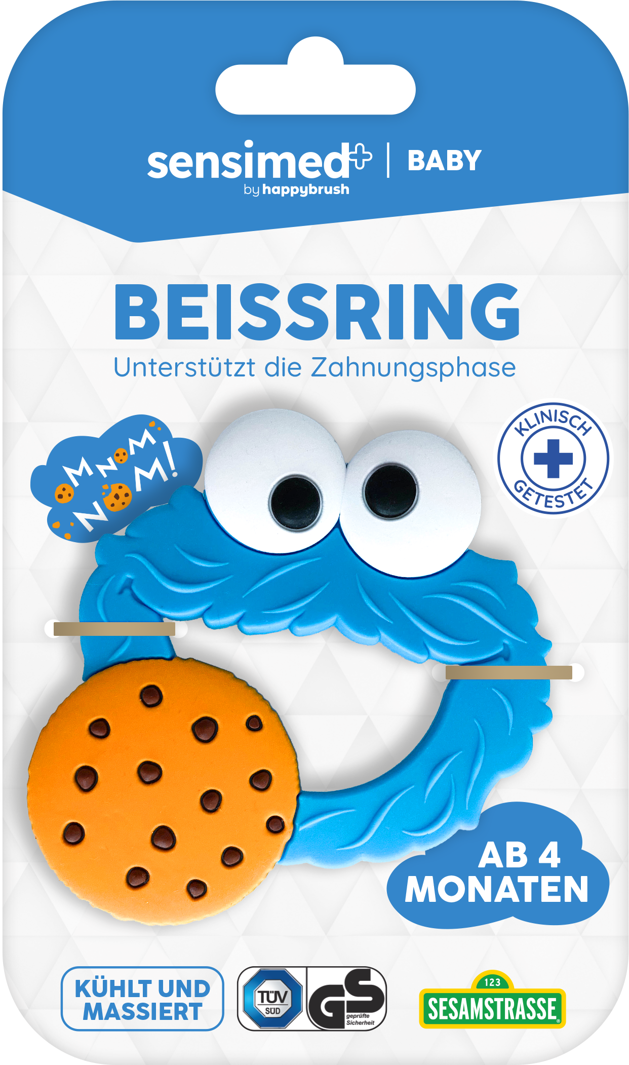 Tento krúžok na prerezávanie zúbkov v dizajne Cookie Monster je ideálny na používanie počas prerezávania zúbkov vášho dieťaťa. Veľká masážna plocha poskytuje príjemnú úľavu od svrbenia a tlaku. Zubný krúžok môžete pred použitím vložiť do chladničky, aby sa príjemne ochladil.