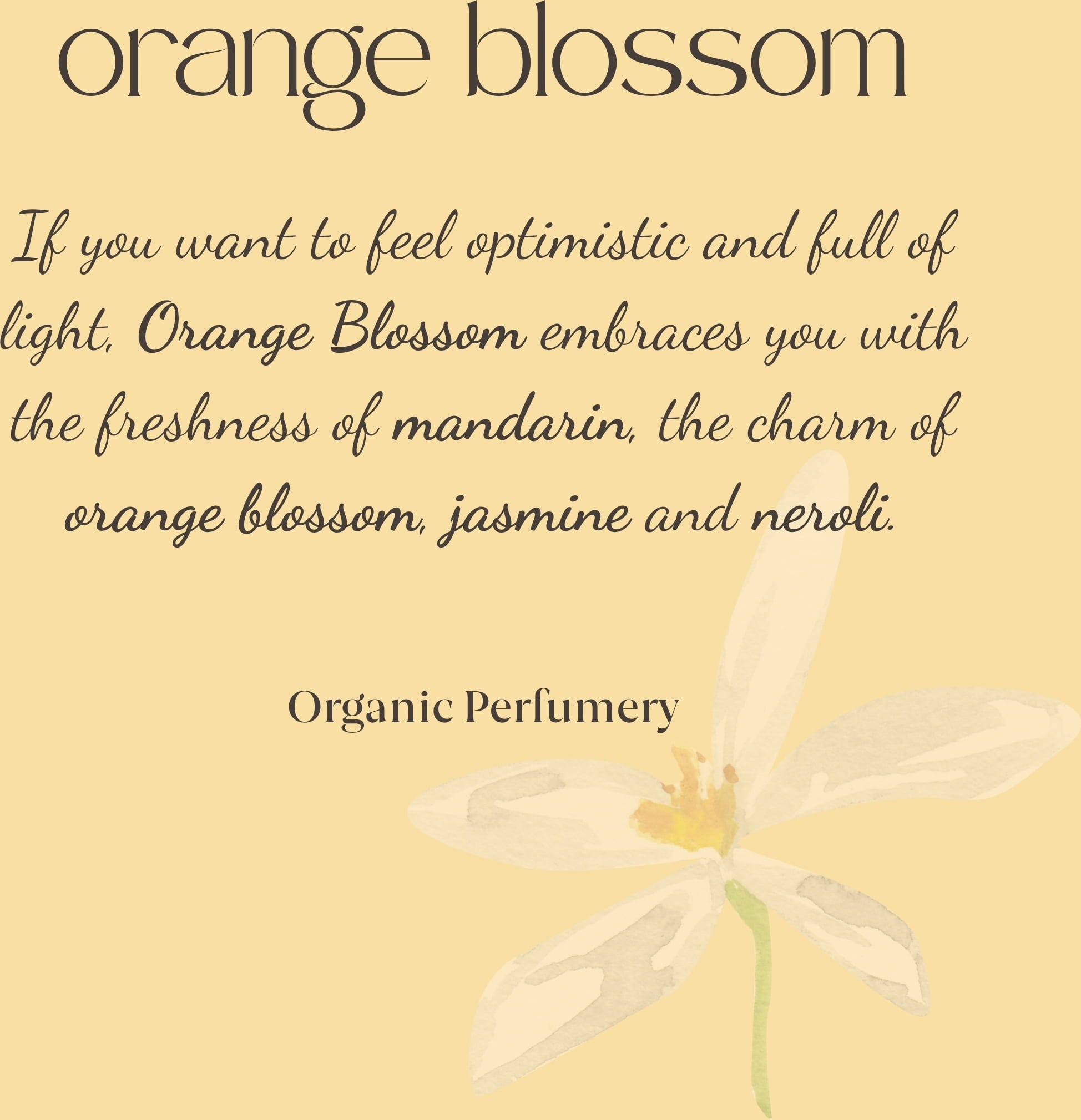 Sladká vôňa Organická svieža vôňa pomarančového kvetu zaujme svojimi sviežimi a jedinečnými tónmi pripomínajúcimi leto v južnom Španielsku. Je vyrobená z čerstvo natrhaných kvetov, ktorých arómy stimulujú zmysly. Macerácia organicky pestovaného pomarančového listu dodáva kolínskej vode ešte prirodzenejší nádych.