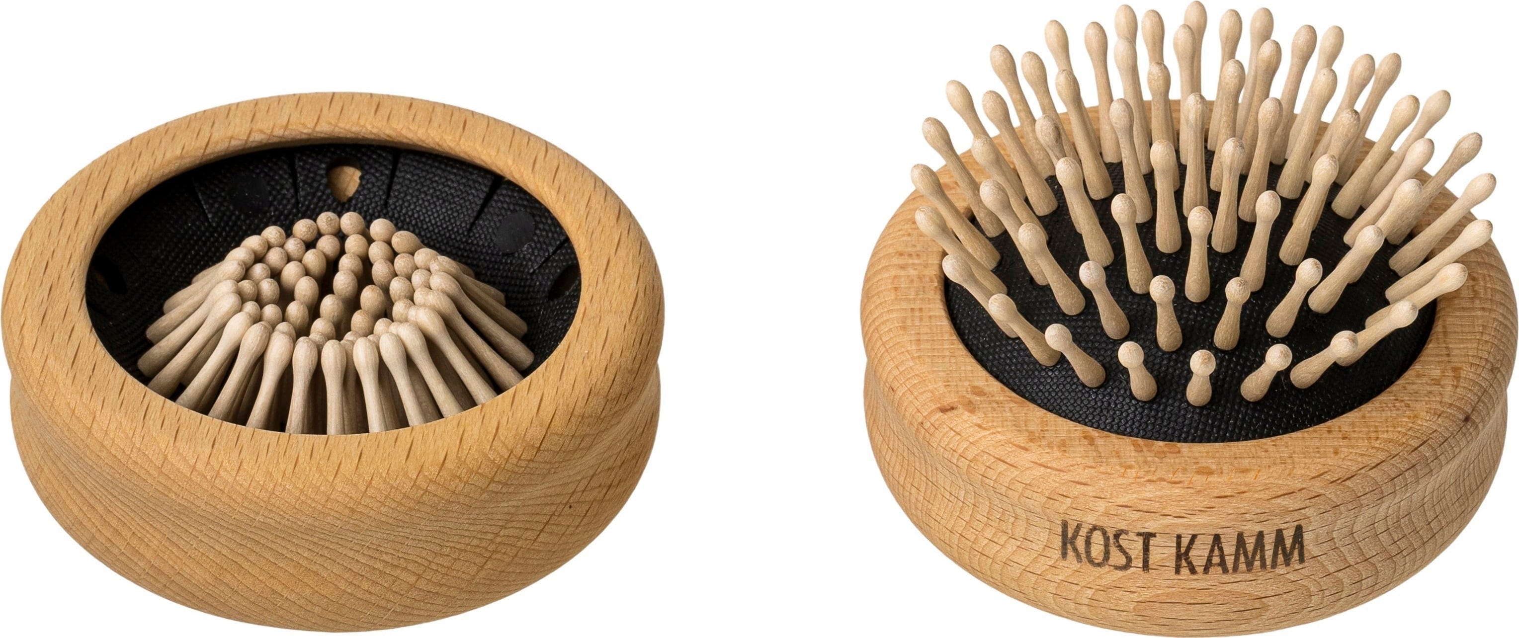 Táto kefa je ideálny na cesty a vďaka kompaktným rozmerom sa zmestí do každej tašky. Drevené kolíky sú vsadené do prírodného kaučuku a môžu sa jednoducho vysúvať a zasúvať.