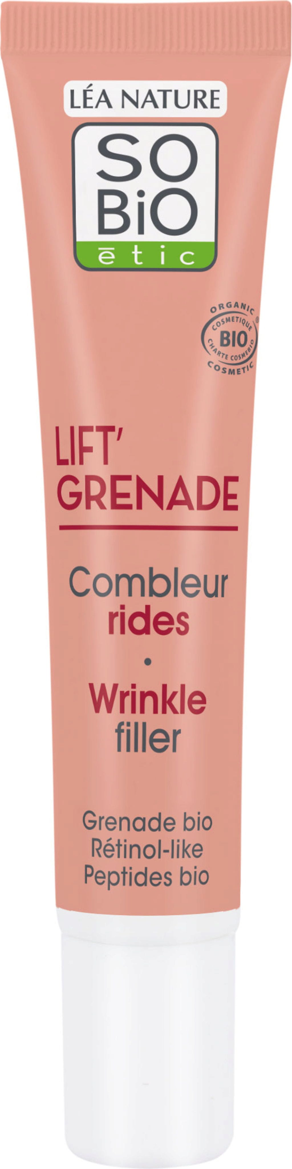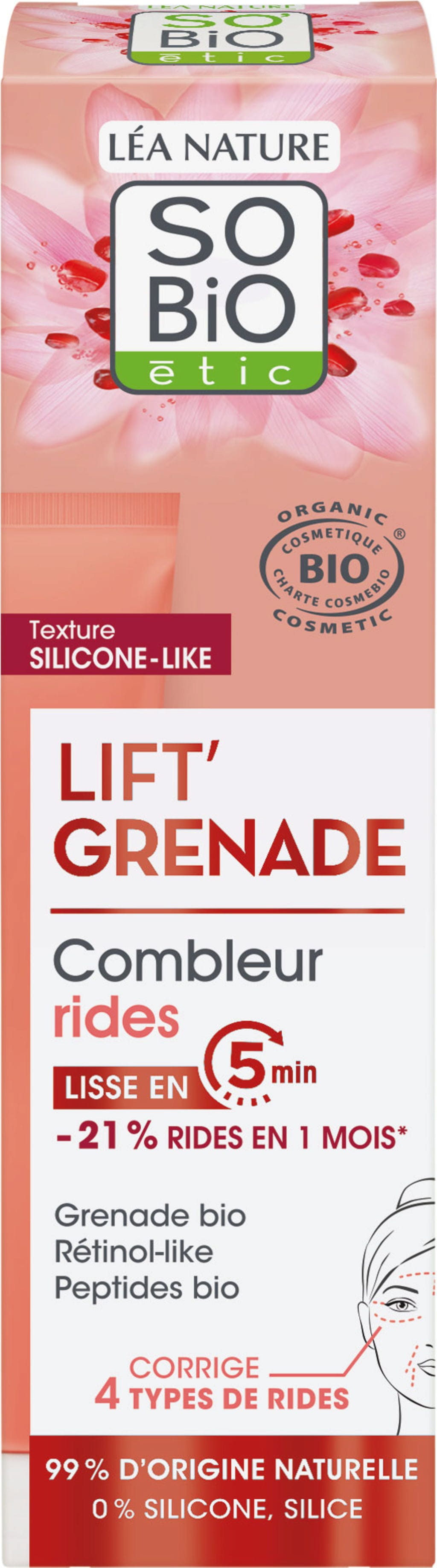 Krém z radu Lift'Grenade ponúka vyhladzujúce vlastnosti a intenzívnu starostlivosť. Vďaka inovatívnej textúre, ktorá kombinuje vyplňujúci a zmatňujúci prášok, vyhladzuje vrásky, jemné linky a nedokonalosti. Účinné aktívne zložky, ako napríklad bio granátové jablko z Francúzska a bio peptidy, ponúkajú rozmaznávajúcu synergiu proti starnutiu.