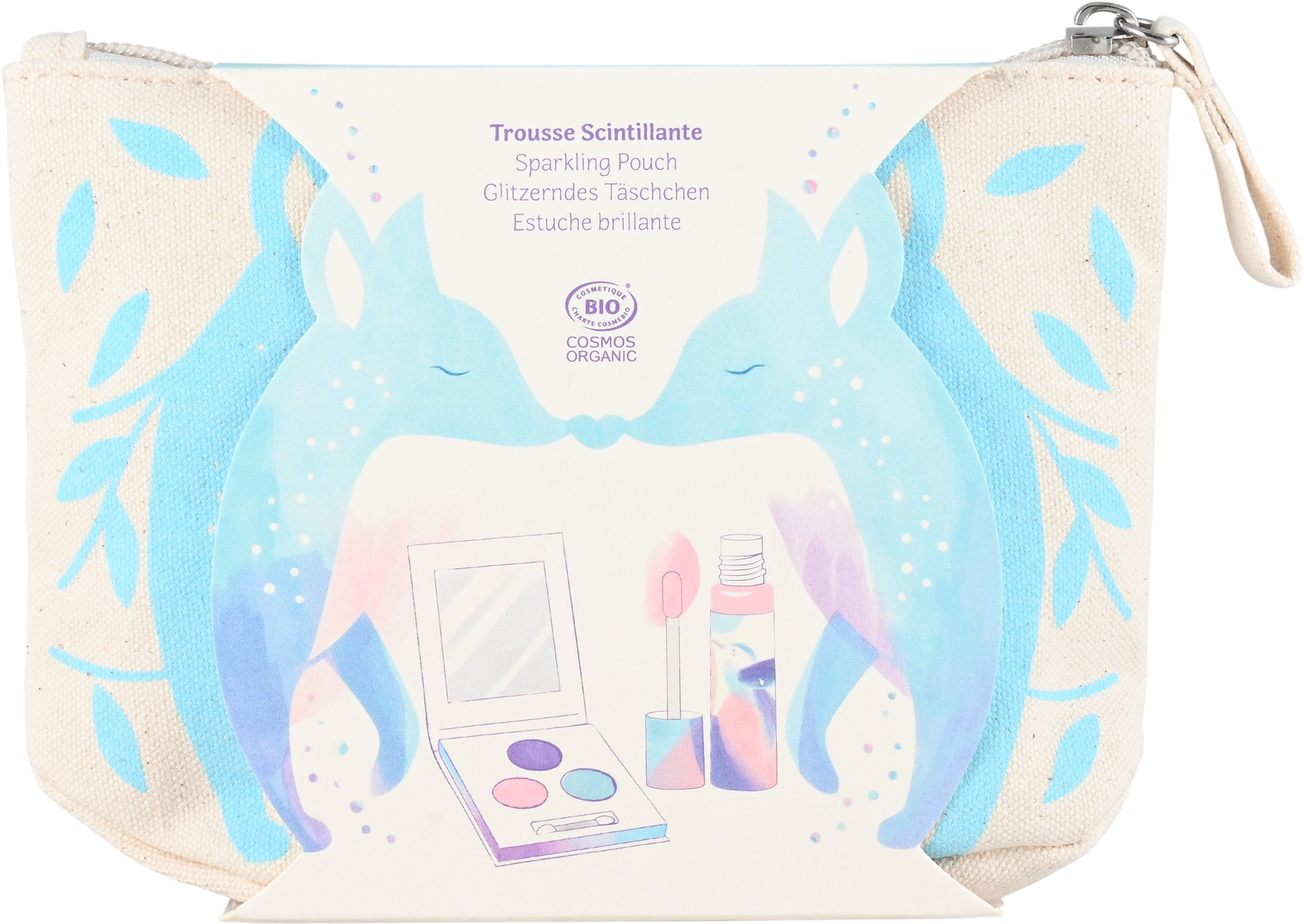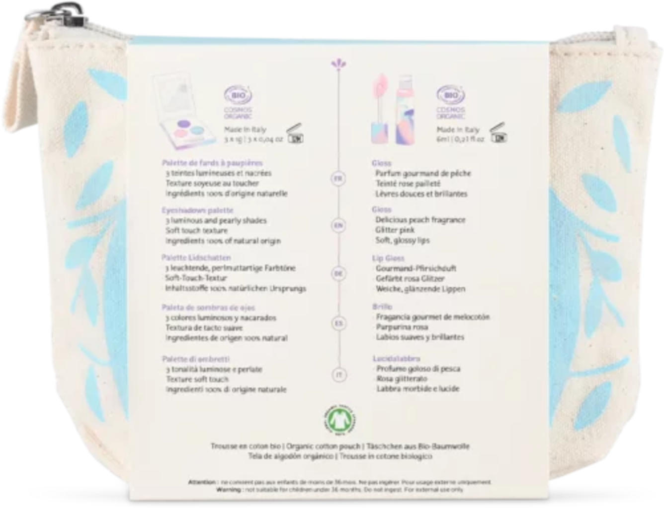 Táto pekná taštička obsahuje všetko, po čom detské srdce túži pri líčení: tri očné tiene v žiarivých a trblietavých odtieňoch a trblietavý lesk na pery s broskyňovou vôňou. Všetky produkty sú šetrné k detskej pokožke, hypoalergénne a ľahko zmývateľné.