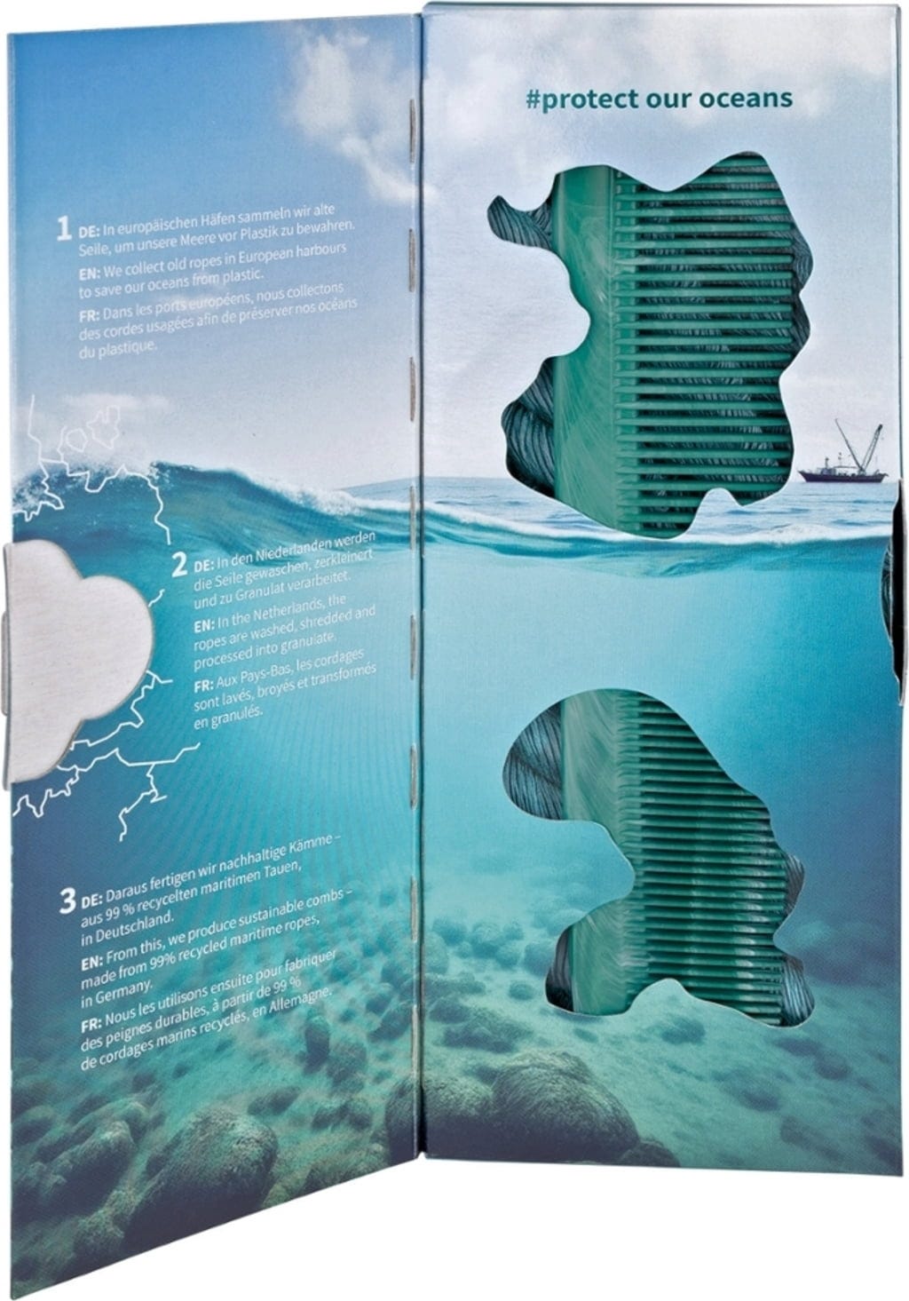 Stylingový hrebeň kombinuje funkčný dizajn s udržateľnosťou. Je vyrobený z recyklovaných lán, vďaka čomu významne prispieva k ochrane oceánov.