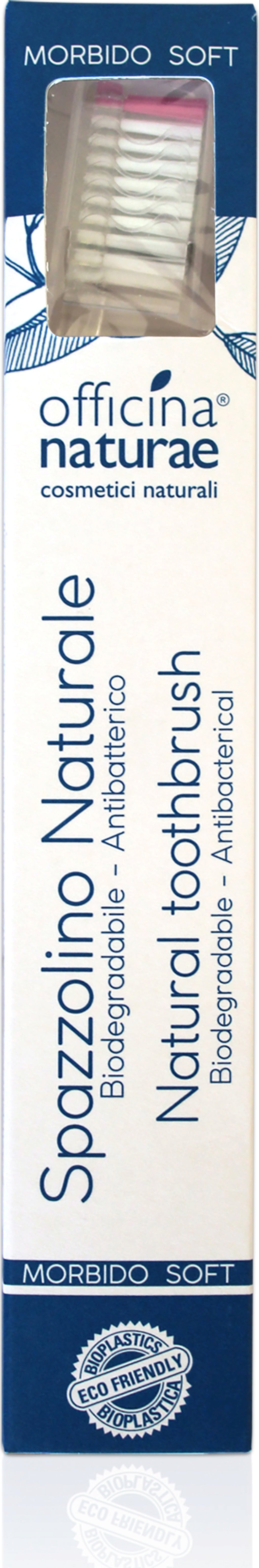 Udržateľná zubná kefka od spoločnosti Officina Naturae čistí zuby optimálne pri každodennej ústnej hygiene. Telo kefky je vyrobené z bioplastu - z drevnej buničiny - a vonkajšie, biele štetiny sú vyrobené z ricínového oleja. Sú obzvlášť jemné, aby nepoškodzovali zubnú sklovinu a chránili ďasná. Centrálne štetiny sú vyrobené z nylonu a sú inovatívnym spôsobom impregnované časticami striebra. Tie dodávajú zubnej kefke po celú dobu životnosti samočistiaci efekt a sú obzvlášť hygienické.