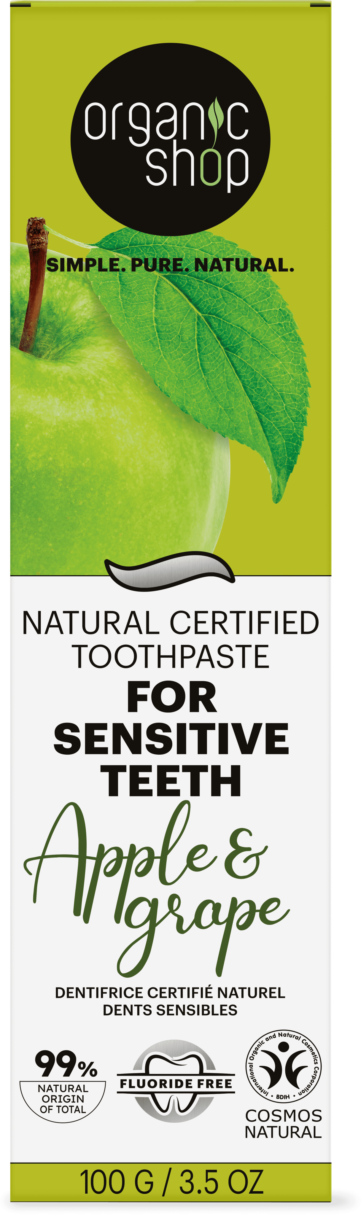 Mimoriadne jemné zloženie tejto zubnej pasty jemne čistí zuby vďaka bio hroznovému oleju bez poškodenia zubnej skloviny. Jemný bio jablkový extrakt zároveň zabraňuje tvorbe zubného povlaku a vyčaruje na vašej tvári krásny úsmev. Zubná pasta sa dodáva v pohodlnej tube bez krabičky, ktorá podporuje ekologický trend minimalizácie balenia.