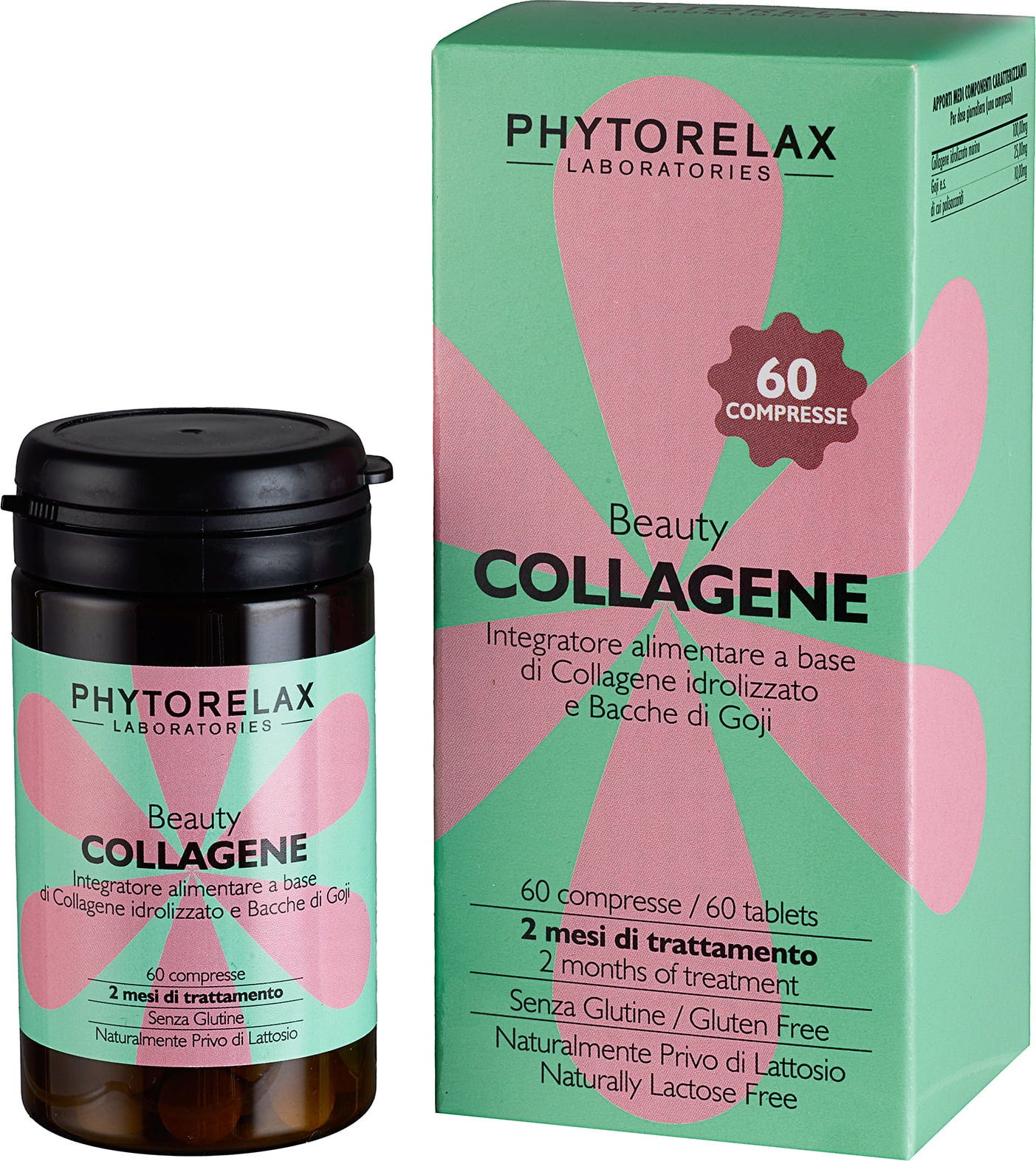 Phytorelax Beauty Collagene je výživový doplnok v praktickej forme tabliet na báze hydrolyzovaného morského kolagénu a extraktu z bobúľ goji. Zloženie je zámerne redukované, neobsahuje lepok ani laktózu a možno ho ľahko začleniť do každodenného režimu.