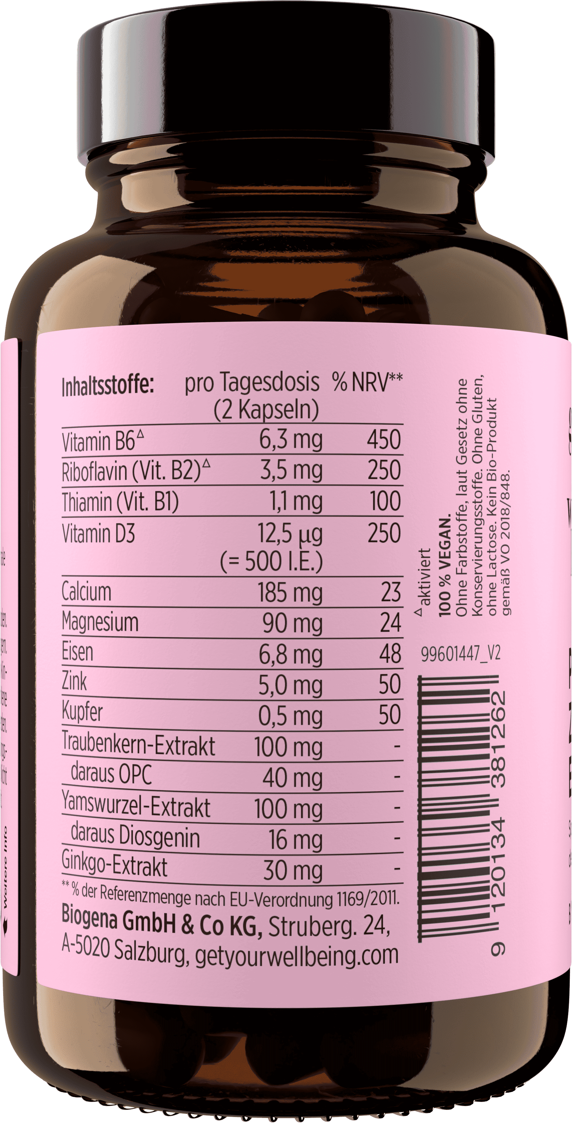 Koralový vápnik, Magnesium mixture (Citrát horečnatý, Magnesium (ako oxid), Magnesium gluconate, Magnesiumcarbonat), Hydroxypropylmetylcelulóza (Obal kapsuly), Extrakt z hroznových jadierok, Extrakt z koreňa divokého jamu, Duo Ferrin Blend (Extrakt z listov kari, Iron bisglycinate), Plnivo (Celulóza), Ginkgo biloba, Zinc bisglycinate, Pyridoxal-5-fosfát, Vitamín D3 (cholekalciferol), Riboflavín-5´-fosfát sodný, Bisglycinát meďnatý, Thiamine mononitrate