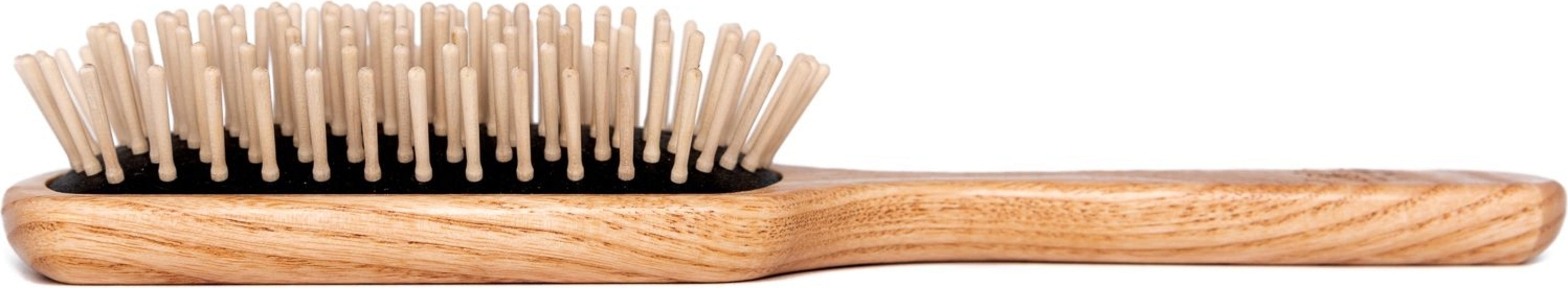Táto obdĺžniková kefa s rozmermi 22 x 6,5 cm je vyrobená z jaseňového dreva s certifikátom FSC® ošetreného ľanovým olejom a karnaubským voskom. Kolíky z hrabu sú umiestnené vo vzduchovej podložke z prírodného kaučuku.