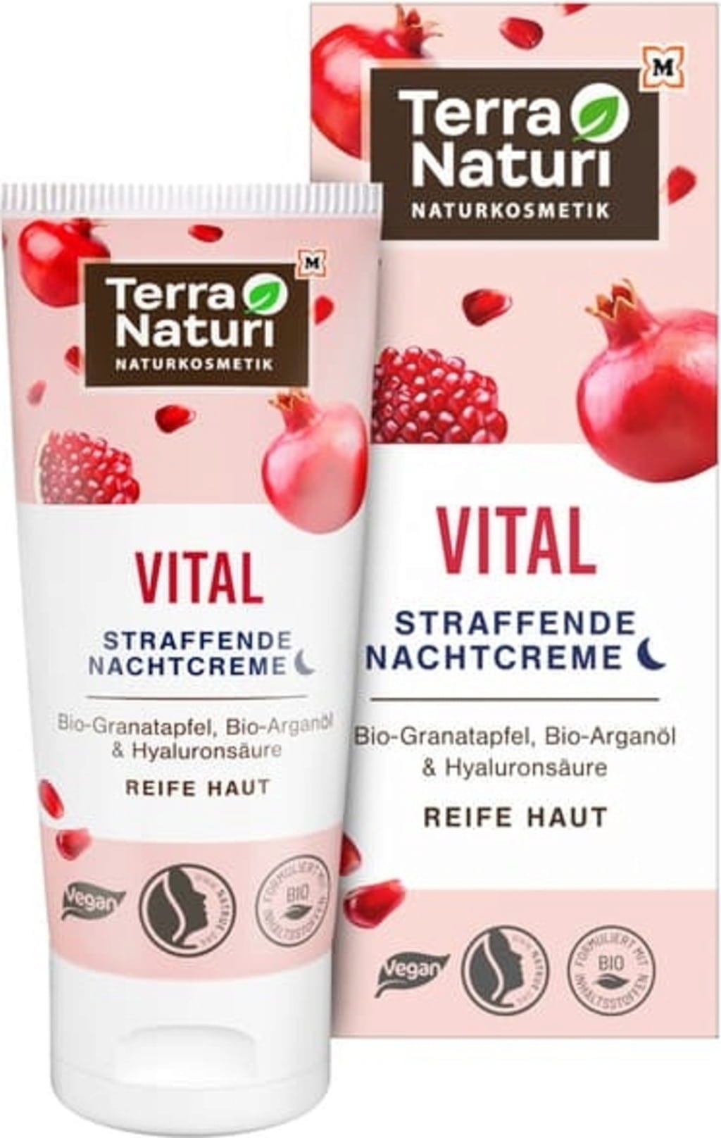 Spevňujúci nočný krém VITAL od Terra Naturi okamžite dodáva zrelej pleti vyživený a hydratovaný vzhľad. Vegánske zloženie je obohatené o extrakt z bio granátového jablka, vzácne bio oleje a kyselinu hyalurónovú, ktoré pleť intenzívne a do hĺbky ošetrujú.
