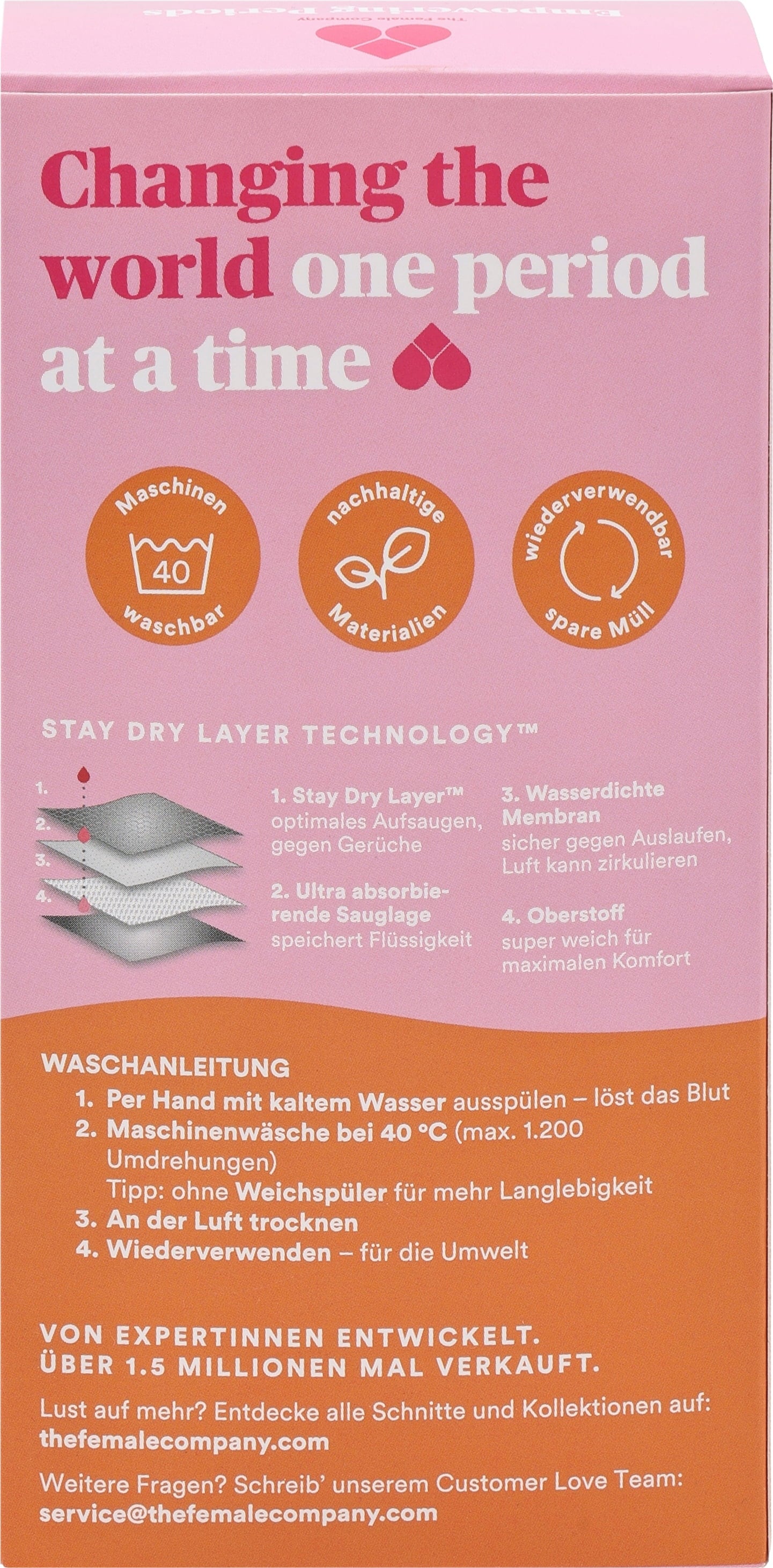 Menštruačné nohavičky s leopardím vzorom sú mimoriadne savé a rýchlo schnú - ideálna voľba na dni so silným krvácaním. Vďaka inovatívnej úprave švov s technológiou Fluid Protection® spoľahlivo chránia aj pred pretečením. A napriek tomu sú len o 1 mm hrubšie ako bežné nohavičky.