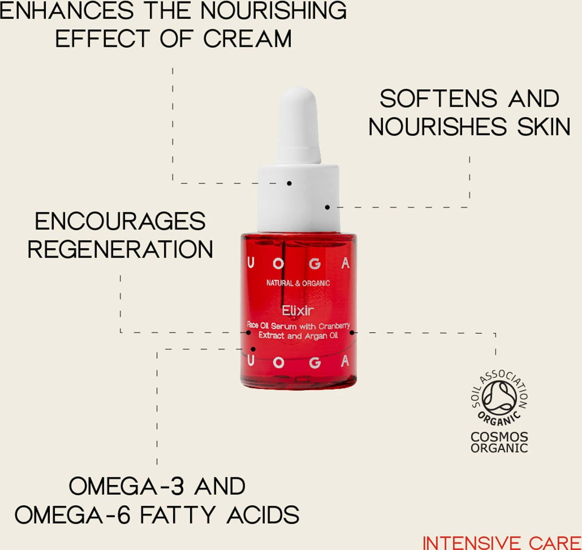 Produkt obsahuje arganový olej bohatý na vitamín E, ktorý zjemňuje a chráni pokožku pred voľnými radikálmi. V kombinácii s regeneračným a vyrovnávajúcim šípkovým olejom a sezamovým a jojobovým olejom je pokožka hlboko vyživovaná. Jednou z výhodných aktívnych zložiek uoga uoga je brusnicový olej. Má vyváženú zmes omega-3 a 6 mastných kyselín a vitamínu E, vďaka čomu je mimoriadne regeneratívny a poskytuje pružnosť.